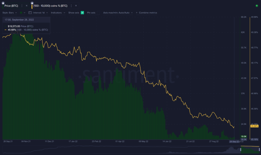 Las ballenas BTC de nivel clave que tienen entre 100 y 10,000 BTC continúan haciendo dump. Durante el año pasado, estas direcciones clave han reducido el 3,5% del suministro a direcciones que tienen un impacto mucho menor en el movimiento futuro de precios. Solo en septiembre, se descartó otro 0.4% del suministro de BTC. En octubre, una tendencia clave a tener en cuenta es la posible acumulación de ballenas.