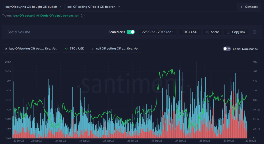 A lo largo de septiembre, las opiniones bajistas ganaron mucha más atención, como se ve en las barras rojas a continuación que representan cuántas menciones hay de “venta”, “vendido” o “bajista”.