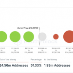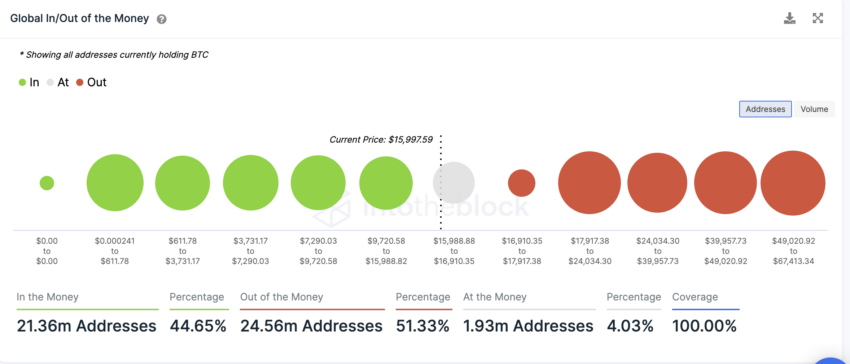 El 4.03% de los monederos son “At the Money“, lo que significa que el precio de BTC está cerca de su precio de compra. Están en un punto de equilibrio. El precio de Bitcoin supera los 16,100 dólares al momento de escribir