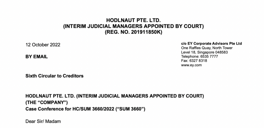 En una actualización del 12 de octubre, los administradores judiciales del problemático prestamista cripto Hodlnaut publicaron su sexta circular a los acreedores.