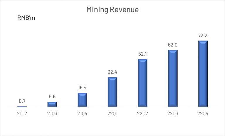 En el cuarto trimestre de 2022, los ingresos por minería fueron de 72,2 millones de RMB (10,5 millones de dólares), un crecimiento del 16,3% con respecto a los ingresos por minería de 62,0 millones de RMB en el tercer trimestre de 2022 (8,9 millones de dólares).