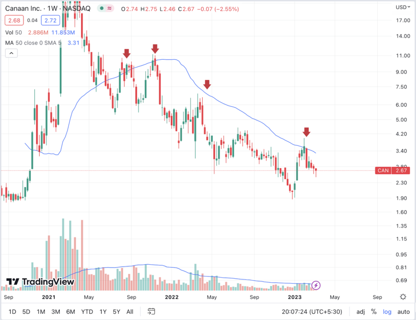 Las acciones de Canaan han tenido una tendencia a la baja, alcanzando mínimos más bajos después del rechazo del promedio móvil simple de 50 semanas.