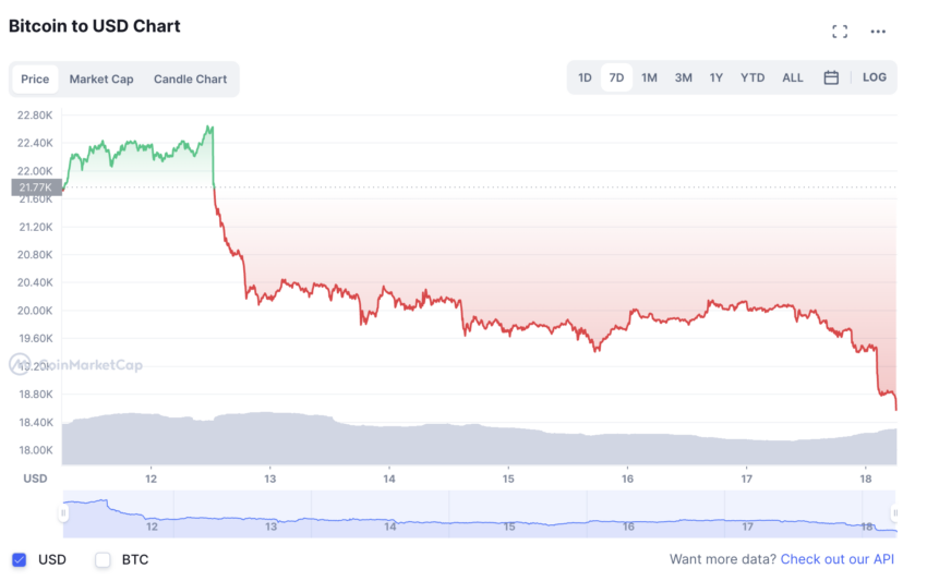 En la última semana, Bitcoin ha tenido un comportamiento bajista, al pasar de los 22,645 a los 18,790 dólares, una caída de hasta 6,5% en tan solo 24 horas, de acuerdo con CoinMaketCap. El último análisis de BeInCrypto expuso que por tercera vez, dos importantes medias móviles hicieron una intersección bajista en BTC; no obstante, la predicción aproxima el precio de la criptomoneda en 41,100 dólares, que se alcanzaría el 14 de agosto de 2023.