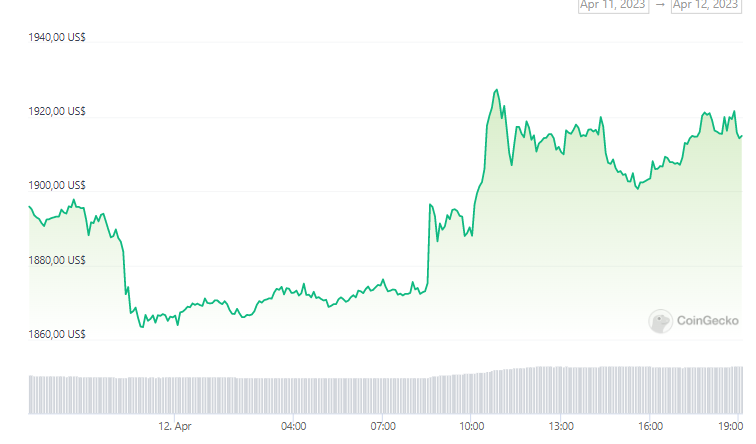 El precio de Ethereum ha reaccionado ligeramente de una forma positiva. Al momento de la publicación. El precio de ETH cotiza en 1,915.83 dólares, aumentando un 1% en las últimas 24 horas.