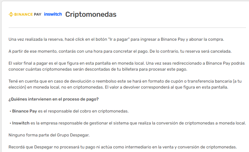 Despegar, la empresa de viajes líder de Latinoamérica y unicornio de origen argentino se unió a Binance, el exchange líder a nivel mundial, e Inswitch, firma global en tecnología financiera integrada. A partir de esta unión de fuerzas, la plataforma incorpora el pago con criptomonedas como una nueva alternativa para sus clientes. Si bien por ahora la funcionalidad se encuentra habilitada únicamente en Argentina, la intención es que pueda expandirse a la región.
