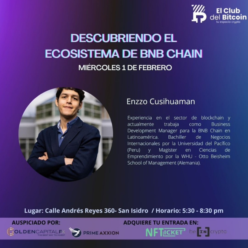 En este evento aprenderemos más del rol de BNB Chain en LATAM junto a Enzzo Cusihuaman, quien cuenta con aproximadamente 2 años de experiencia en el ámbito de blockchain y actualmente desempeña el cargo de gerente de desarrollo de negocios para BNB Chain en Latinoamérica. Además, es titulado en negocios internacionales por la Universidad del Pacífico (Perú) y tiene un Master en Ciencias Empresariales por la WHU – Otto Beisheim School of Management (Alemania).