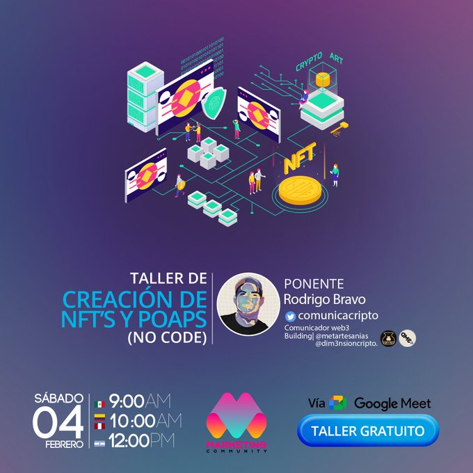 En este evento aprenderás a crear NFT y POAP sin necesidad de ser un especialista técnico. Rodrigo Bravo, líder de @metartesanias y host de Dim3nsión cripto estará compartiendo sus mejores tips para comenzar en este mundo Web3 y poder plasmar tus obras.