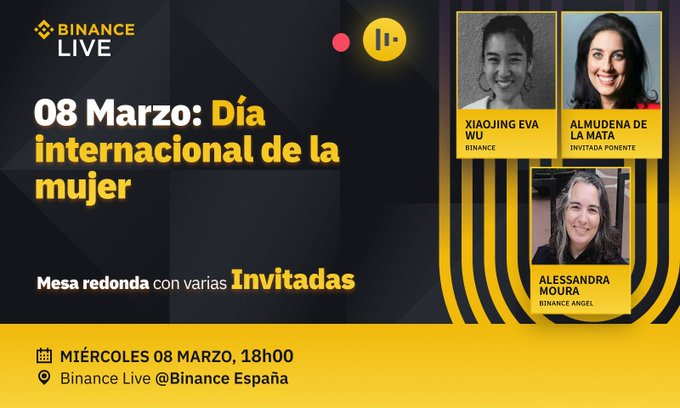 En este evento, Xiaojing Eva Wu de Binance estará conversando junto a Alessandra Moura (Binance Angel) y Almudena de La Mata sobre el día internacional de la mujer y el rol de ellas en el espacio cripto.