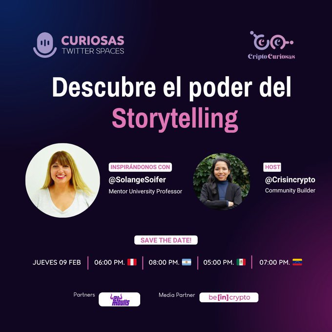 En este evento @criptocuriosas estará demostrando el poder que tienen las estrategias de comunicación para contar historias en el mundo Web3. En esta ocasión @SolangeSoifer será la invitada para exponer el potencial del storytelling gracias a su experiencia como mentora de universidad.