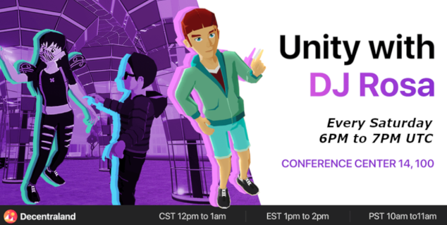 Fiesta en el metaverso con DJ Rosa, ven al metaverso y baila junto a la comunidad de Unity Café en el Decentraland Conference Center. En este lugar podrás conversar, bailar, hacer networking y aprender más de este metaverso mientras escuchas buena música.