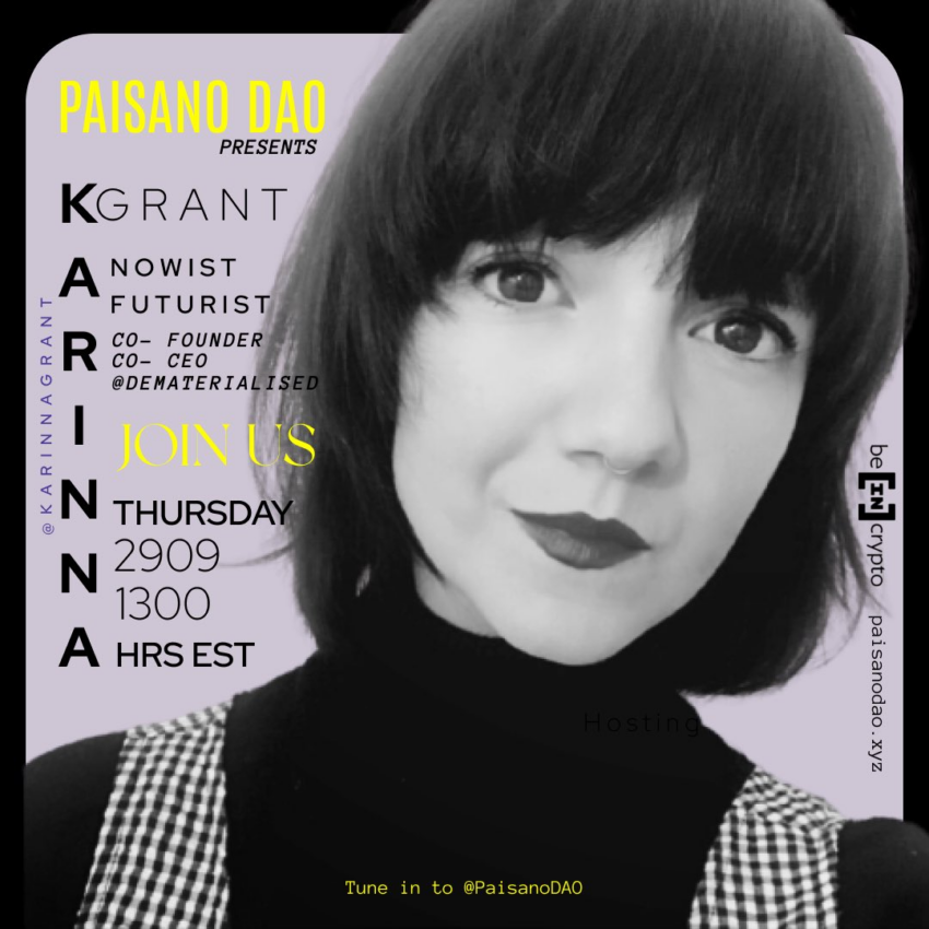 En este espacio la comunidad de @paisanodao nos presenta a la artista Karinna Grant (Co-Founder y Co-CEO de @dematerialised) una educadora de moda y hipercuriosa Nowist. Actualmente, está centrada en la evangelización de la moda digital. Karinna Grant se encuentra impulsando la industria de la moda digital con la empresa social HOT:SECOND y el espacio de mercado experimental NFT THE DEMATERIALISED, que cofundó con Marjorie Hernandez.