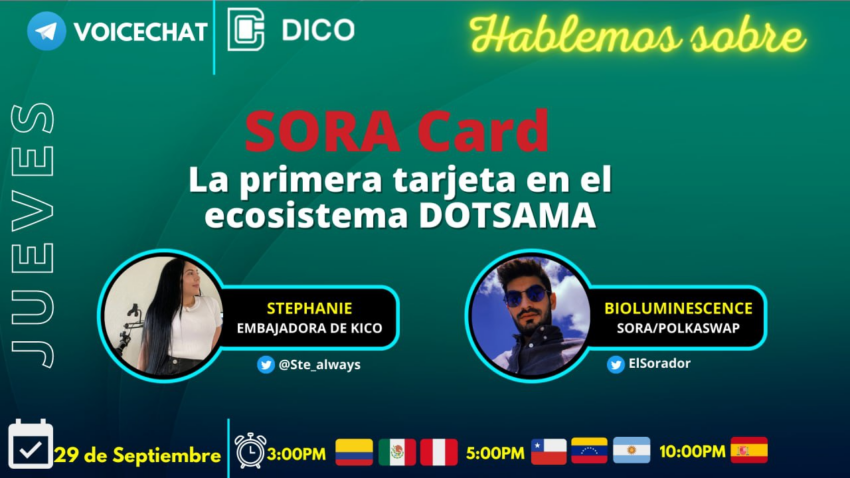 En este evento el equipo de KICO estará conversando con el equipo de SORA para resolver todas tus dudas sobre este proyecto y los beneficios que trae al ecosistema DOTSAMA.