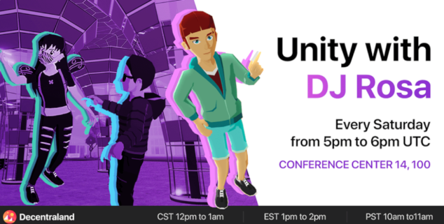 Fiesta en el metaverso con DJ Rosa, ven al metaverso y baila junto a la comunidad de Unity Café en el Decentraland Conference Center. En este lugar podrás conversar, bailar, hacer networking y aprender más de este metaverso mientras escuchas buena música.