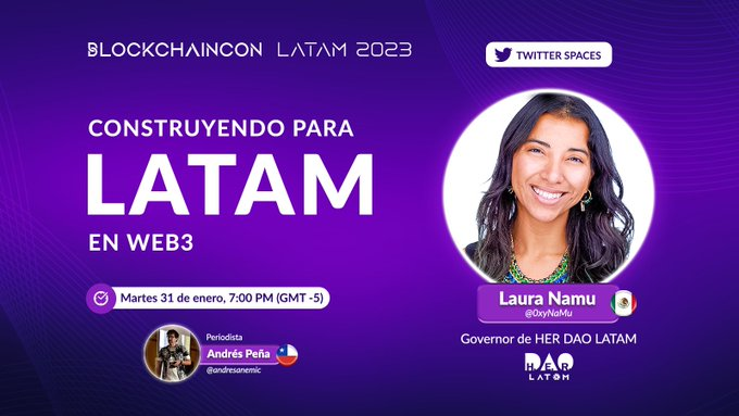 En este evento el equipo de @blockchainconla contará con la presencia de Laura Namu, Governor de @herdaolatam y Co-founder de @ethereum_mexico, una de las personas con mayor impacto en el ecosistema Web3 de México que trabaja con la misión de recortar la brecha de género y aumentar la adopción de Web3 en LATAM.