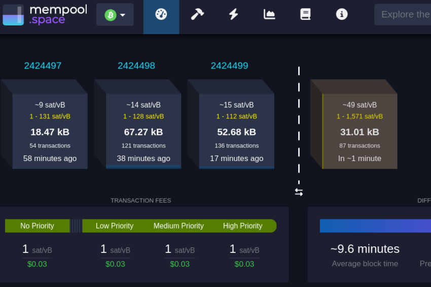 La testnet de Bitcoin, vista desde el explorador Mempool.Space, luce así:
