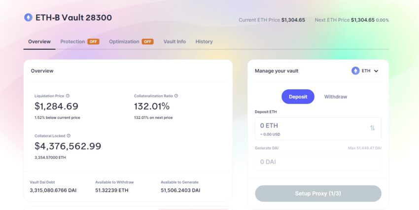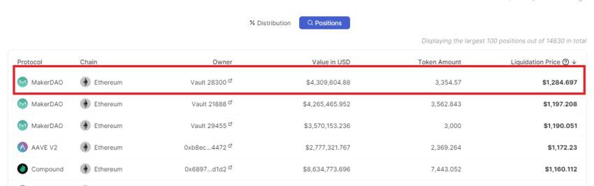 Los datos disponibles apuntan a un vault de MakerDAO que se enfrenta a una liquidación de 1,284 dólares. El valor es de unos 4,3 millones de dólares, como se ve en DeFiLlama.