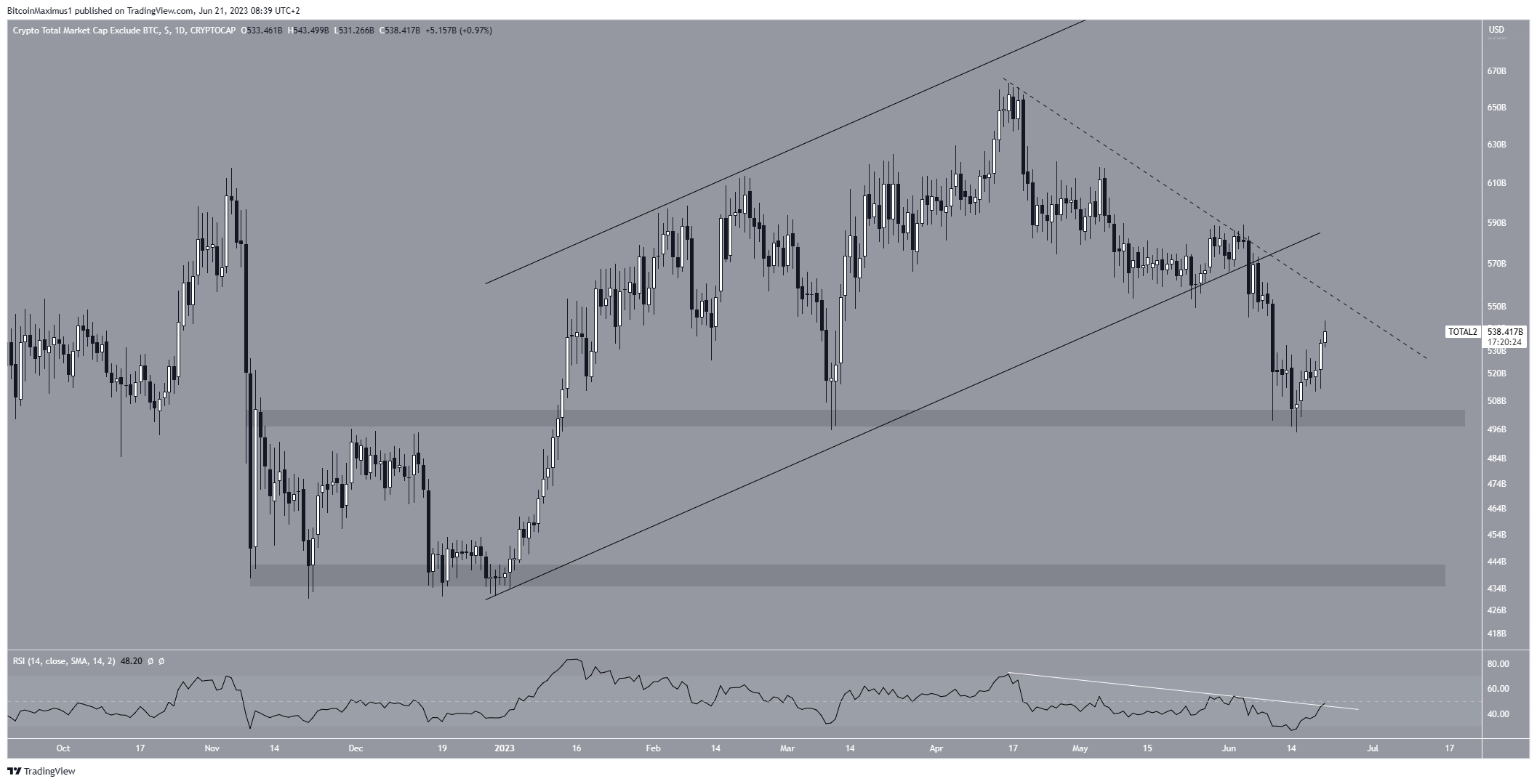 A diferencia de Total Market Cap, el análisis técnico de Altcoin Market Cap da una lectura bajista. La razón principal de esto es la ruptura de un canal paralelo ascendente de largo plazo, que había estado en vigor desde principios de año.