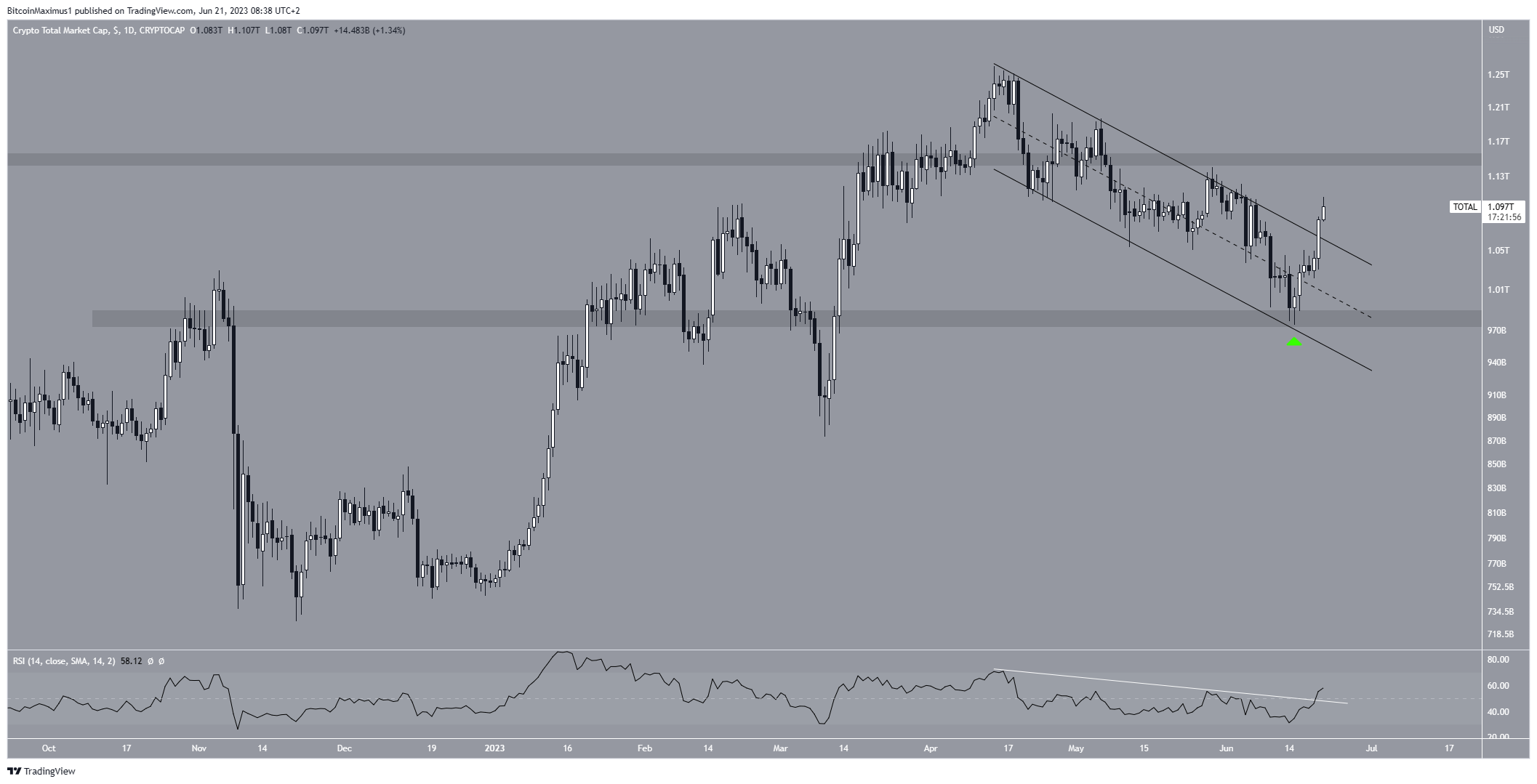 La capitalización total del mercado cripto ha caído dentro de un canal paralelo descendente desde el 15 de abril. Dichos canales generalmente contienen movimientos correctivos, lo que significa que es probable que se rompa el patrón.