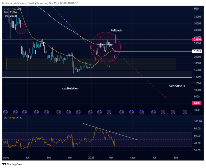 La tendencia actual continúa siendo bajista, tal y como lo explicamos en nuestro análisis macro. Pese al movimiento observado en las últimas sesiones, el RSI sigue presentando una marcada divergencia bajista en semanal, proyectando en el macro, los objetivos: 18,600 dólares, 16,400 dólares, 13,800 dólares, 12,500 dólares y 9,500 dólares.