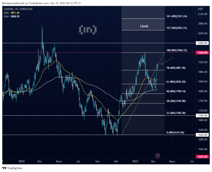 La cotización del oro podría presentar un nuevo impulso alcista con objetivo al 127.2 de Fibonacci de su máximo histórico: los 2,060 dólares por onza.
