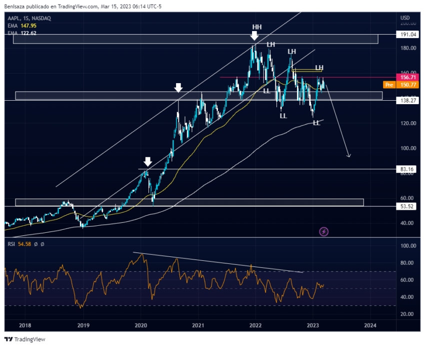 Para el caso de Apple, viene presentando una divergencia bajista en tiempo semanal desde el 2020. Esta es una postura que acompaña el comportamiento tanto del Dow Jones como del Nasdaq y que explicamos en nuestro análisis técnico macro de mercado.