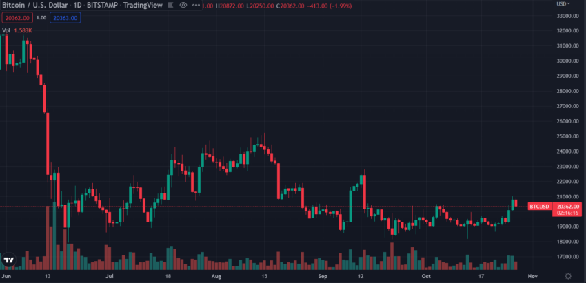 Bitcoin cayó bruscamente de 20,621.23 dólares aproximadamente a las 4 p.m. (ET) a 20,293.40 dólares, mientras que Ethereum cayó de 1,561.40 dólares a 1,515.33 dólares. Desde entonces, Bitcoin se ha recuperado a 20,362 dólares.
