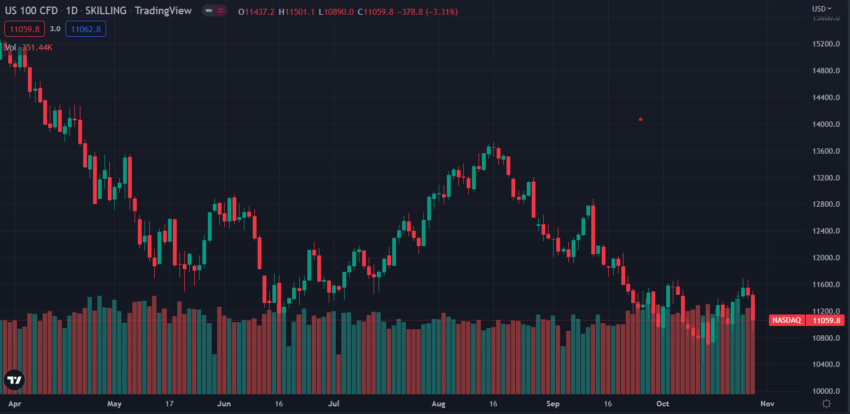 El Nasdaq Composite experimentó una fuerte caía del 3% para alcanzar los 11059.8.