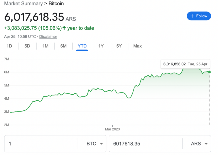 El mes pasado, el precio de Bitcoin alcanzó un máximo histórico en el peso argentino (ARS), con el tipo de cambio de BTC superando los 6,59 millones de ARS, según los datos de precios agregados rastreados por Google Finance.