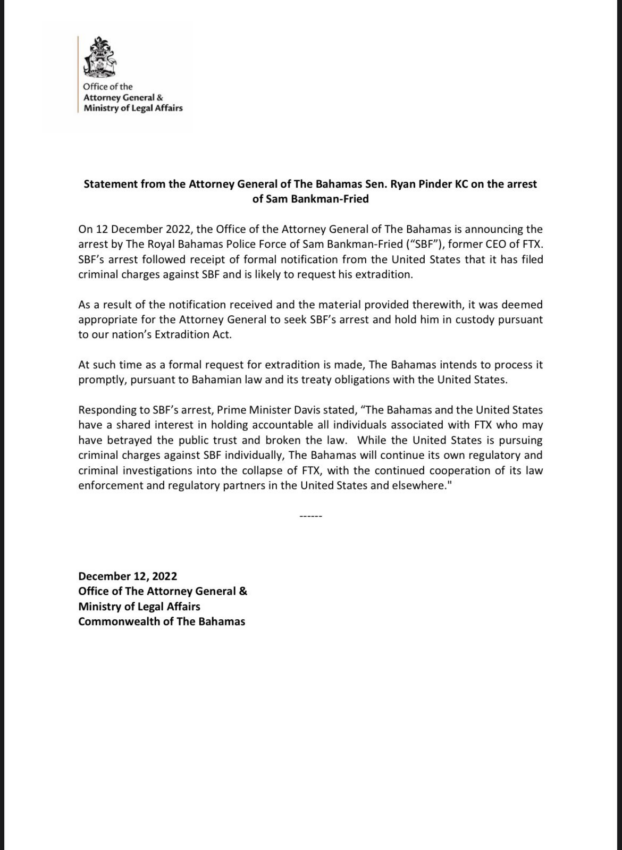 “El 12 de diciembre de 2022, la Oficina del Fiscal General de las Bahamas anuncia el arresto por parte de la Policía Real de las Bahamas de Sam Bankman-Fried (“SBF”), ex CEO de FTX. El arresto de SBF siguió a la recepción de una notificación formal de los Estados Unidos de que había presentado cargos criminales contra SBF y es probable que solicite su extradición”.