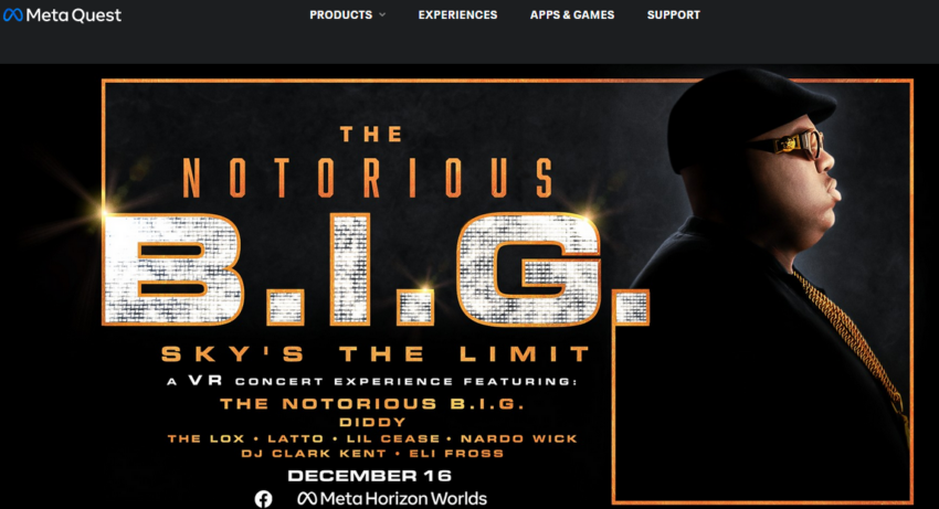 El avatar del difunto rapero Biggie Smalls, también conocido artísticamente como Notorious B.I.G, tuvo presencia virtual en el evento de Meta Horizon World. En dicho evento, los asistentes pudieron experimentar, al menos por un momento la representación del artista como si lo estuvieran presenciando en un concierto real.