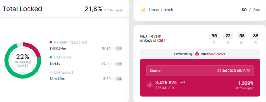Información desprendida de la plataforma indica que el evento está programado para el 22 de julio y desbloquearía 1,266% del suministro total de AXS, lo que equivaldría a poco más de 3.4 millones de tokens, con un valor aproximado de 23 millones de dólares. Además, datos del mismo lugar señalan que más del 22% permanecen bloqueados, lo que se traduce en 59 millones de AXS, es decir, un aproximado de 400 millones de dólares.