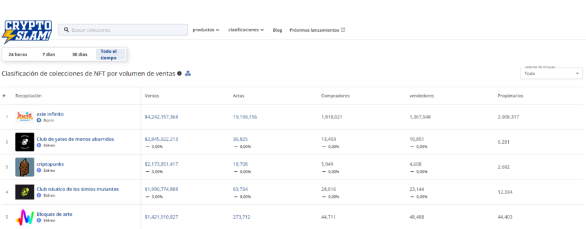 Al momento de la redacción de este artículo, las ganancias por ventas totales generadas solo por la colección NFT de Axie Infinity superaban los 4.200 dólares en poco más de 19 millones de transacciones. Así mismo, el número de vendedores y compradores ya está por encima de los 1.8 millones y 1.3 millones, respectivamente, al igual que la cifra de propietarios que también subió sus métricas por encima de los 2 millones.