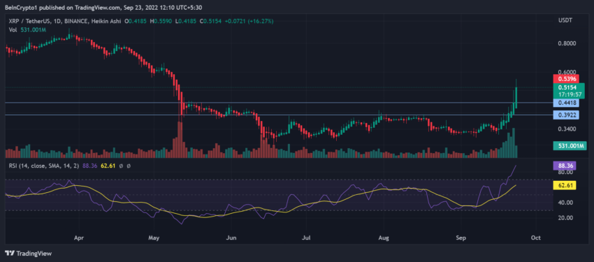El precio de XRP osciló en la marca de $ 0,536 en el momento de la publicación, registrando ganancias del 27,27 % en el gráfico de 24 horas y ganancias de casi el 67 % en el gráfico de precios semanal.
