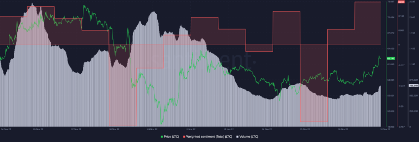 Tras la reciente caída inducida por FTX, el precio de LTC cayó a un mínimo de 47.60 dólares. Sin embargo, se recuperó rápidamente en los próximos días. Los datos de Santiment mostraron que LTC experimentó un aumento en los volúmenes de trading a medida que su sentimiento ponderado cambió a positivo.