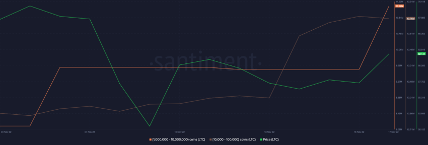 Los datos de Santiment sugirieron además que dos de las cohortes de ballenas LTC más grandes agregaron más de cinco millones de LTC a sus carteras desde el 5 de noviembre.