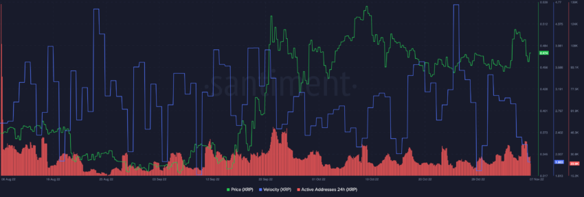Además, la velocidad de XRP tendió a la baja, lo que significaba que la moneda no se usaba mucho para transacciones dentro del marco de tiempo establecido.