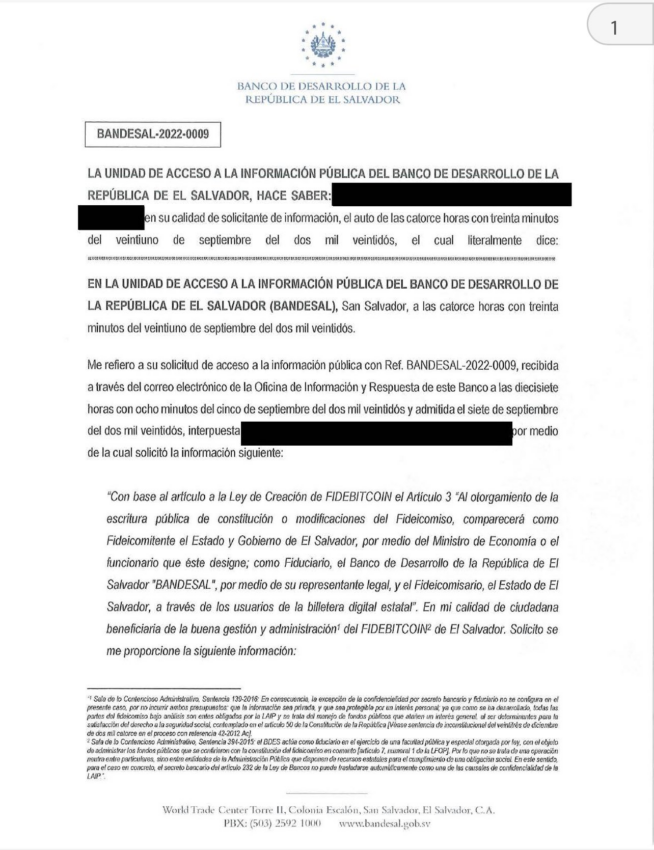 “El pasado mes de septiembre, BANDESAL denegó por segunda vez entregar información sobre la compra y venta de Bitcoin por parte del gobierno salvadoreño, alegando reserva y contrariando el principio de máxima publicidad y proporcionalidad.”