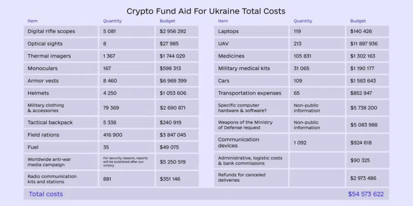 Como Ucrania se ha estado defendiendo de una invasión rusa, ha recurrido a las criptomonedas para respaldar sus esfuerzos. Varias personas y grupos de la comunidad se han unido para ayudar a Ucrania. Recibió 54 millones de dólares en criptomonedas a partir de agosto de 2022, mientras que el sector NFT también ha sido un factor contribuyente.
