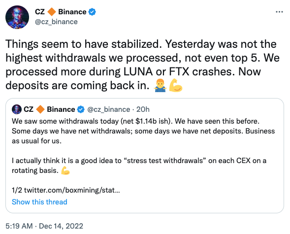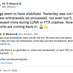 Ante la avalancha de datos on-chain sobre las salidas de criptomonedas del exchange de criptomonedas CZ ha salido a calmar las aguas y afirmar que Binance tiene suficiente capital para aguantar el chaparrón. CZ citó que las salidas de capital no entran siquiera en su top5 de eventos con más retiros de criptomonedas, mencionando que “procesaron más retiros con el colpaso de LUNA y FTX”, cerrando con que “los depósitos están comenzando a regresar”.