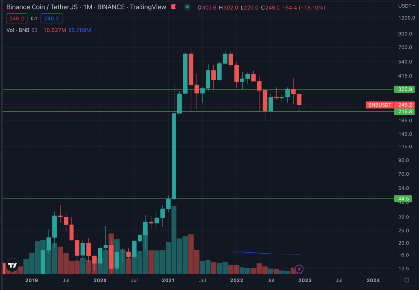 El analista compartió que el gráfico de BNB está formando un doble techo, un patrón bajista en un marco de tiempo mensual. El precio cerró por debajo de 325,722 dólares, lo volvió a probar y no logró cerrar por encima.