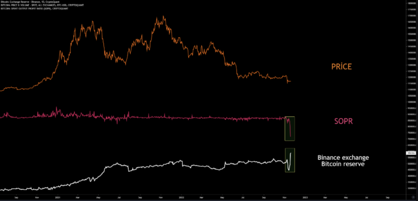 Una tendencia a tener en cuenta fue que cuando las reservas de intercambio de Binance aumentaron, lo mismo vio una caída en BTC SOPR. El índice de ganancias de producción gastada (SOPR), que mide los índices de ganancias y pérdidas de acuerdo con el cambio entre los precios de compra y venta de la moneda, se desplomó a 0,87 el 13 de noviembre.