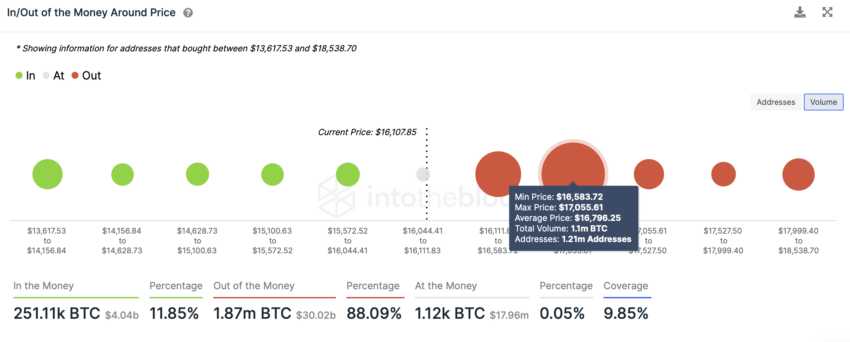 En el futuro, si el precio de Bitcoin puede establecerse por encima del nivel de 16,796 dólares, donde 1,2 millones de direcciones contienen 1,1 millones de BTC, el nivel podría convertirse en un fuerte soporte.
