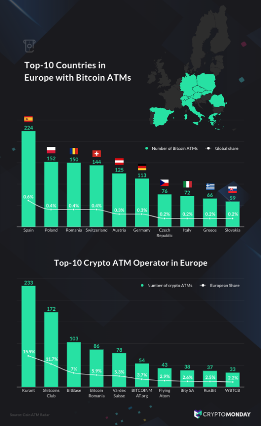 La instalación de estos cajeros bitcoin ha aportado enormemente a que España sea líder indiscutible en número de cajeros bitcoin de Europa. En febrero, España contaba con 224 cajeros bitcoin, mientras que la segunda posición lo ocupaba Polonia con 152 cajeros bitcoin.
