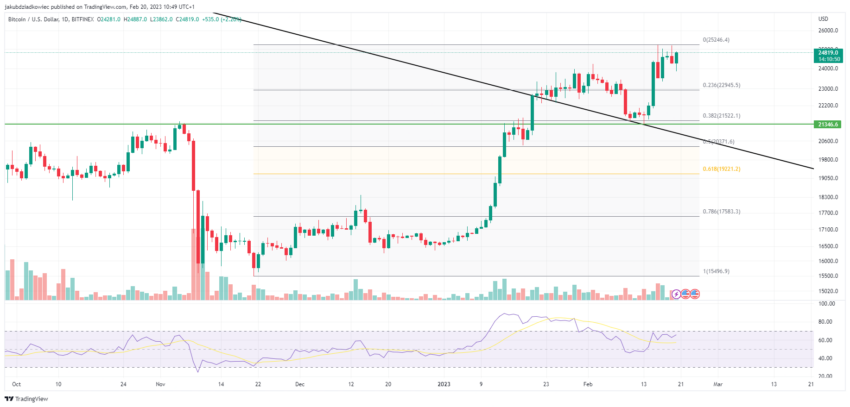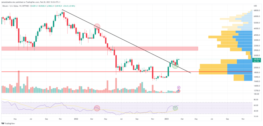 Al mismo tiempo, la corrección ha validado el nivel de 21,300 dólares como soporte (línea verde). Anteriormente, esta zona rechazó el precio de BTC a principios de noviembre de 2022. Por otro lado, en enero de 2023, Bitcoin se consolidó por debajo de este nivel durante varios días antes de romper con fuerza más tarde.