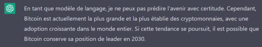 En cualquier caso, entre los altibajos, las dos primeras criptomonedas del sector deberían encontrar su camino. De hecho, la inteligencia artificial no mencionó a ningún rival potencial. Sin embargo, una cosa parece no estar dispuesta a cambiar en 2023 o 2030: Bitcoin tiene la ventaja.