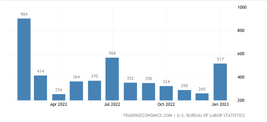 En enero, los puestos de trabajo aumentaron en 517,000, por encima de la estimación del Dow Jones de 187,000. El desempleo llegó al 3,4%, el mínimo de décadas, superando las previsiones del 3,6%.