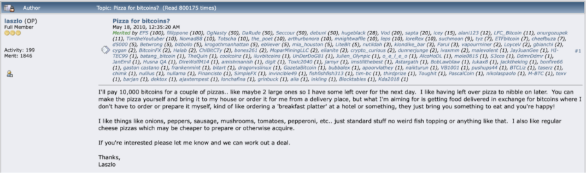 ¿Qué ocurrió exactamente aquel sábado de 2010? Laszlo Hanyecz, un desarrollador de Bitcoin, hizo historia al comprar dos pizzas grandes por 10.000 BTC. La transacción se hizo a través del foro Bitcointalk con un post que decía lo siguiente: