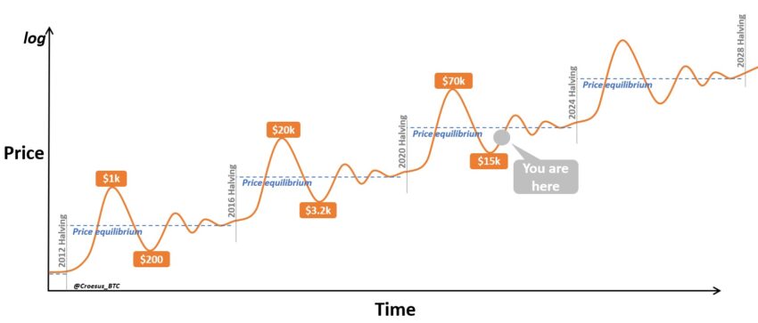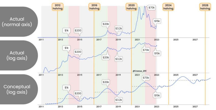 Halving de Bitcoin vs Gráfico de precios. Fuente: Twitter/@Croesus_BTC