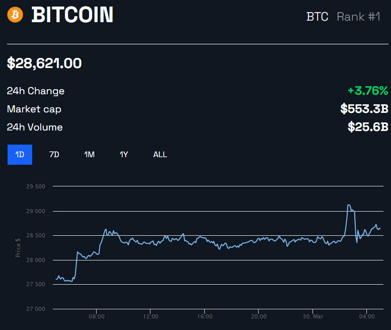 En el momento de la publicación, BTC cotizaba a 28,621 dólares, tras una ganancia diaria del 3.7%.
