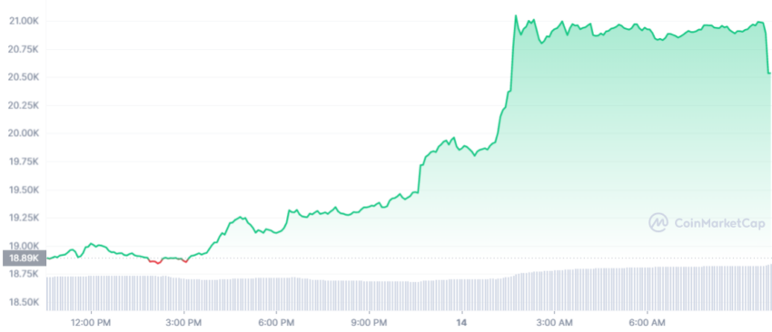 La criptomoneda insignia ha subido un 25.9% en los últimos 14 días y experimentó un rápido aumento del 11% en las últimas 24 horas para cruzar la marca de los 20,000 dólares. La impresionante racha lo vio cotizar brevemente por encima de los 21,000 dólares durante las primeras horas de trading del 14 de enero.